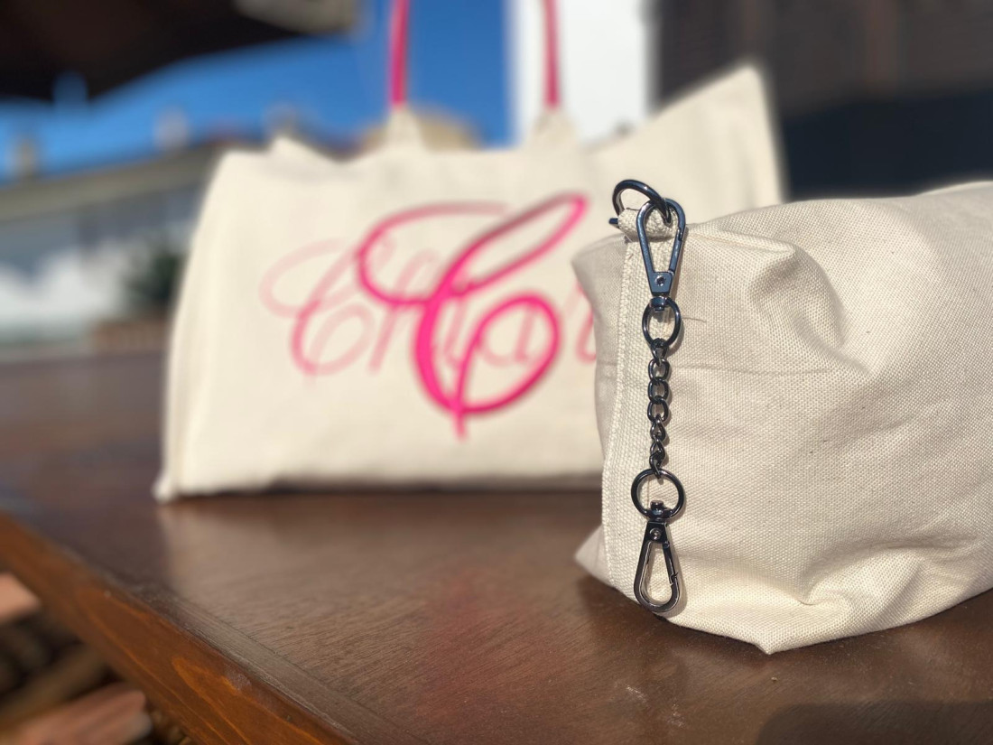 I manici sono ricamati con lo stesso colore della scritta, inoltre vi è una pochette interna estraibile con cerniera agganciata alla borsa da moschettone e catenella.