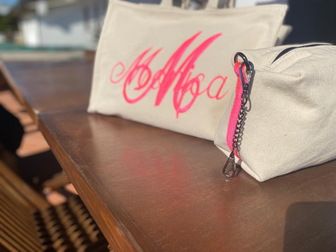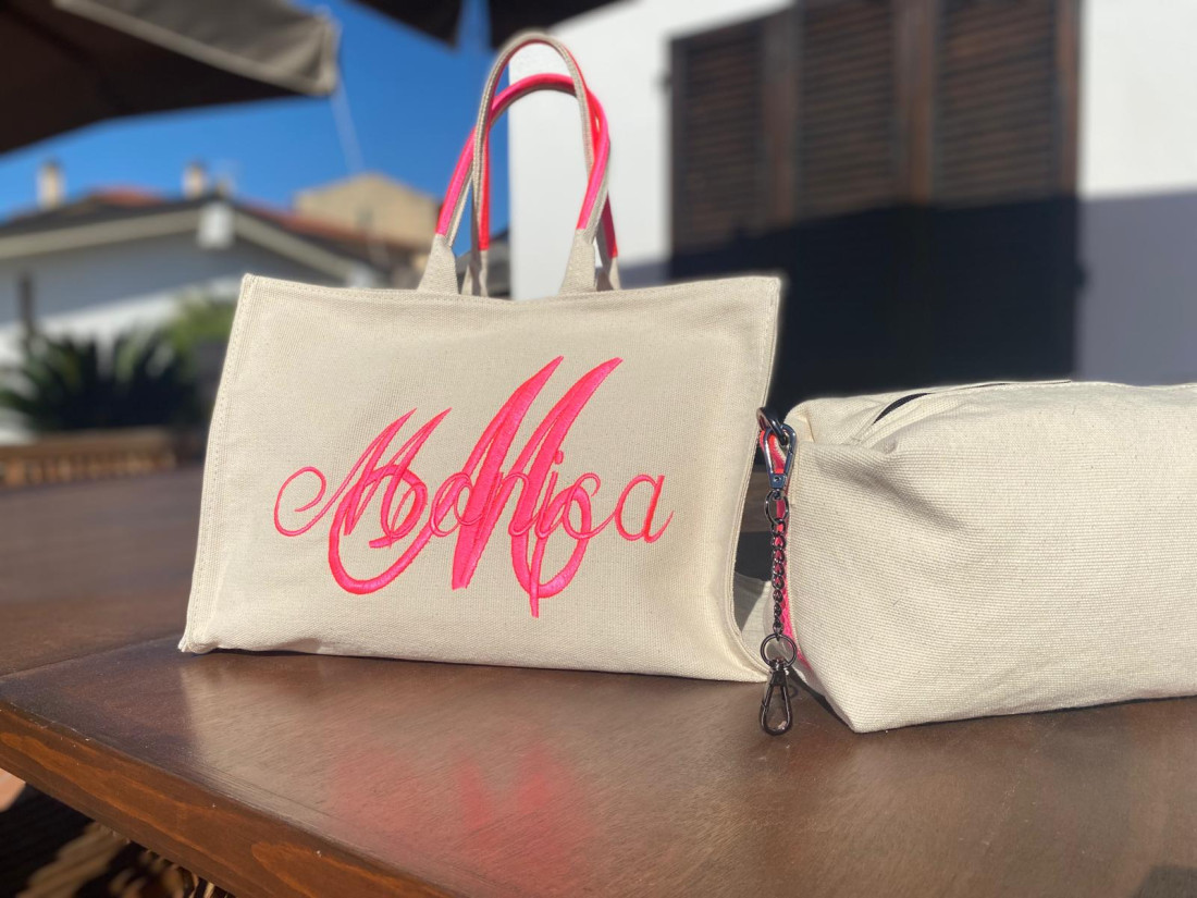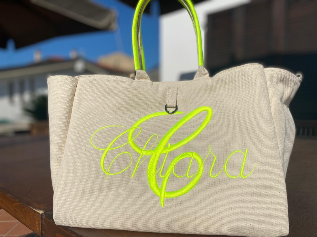 Borsa da mare e da passeggio in tessuto canvas reversibile con manici doppi e personalizzata sia internamente che esternamente con presenza di ricamo.