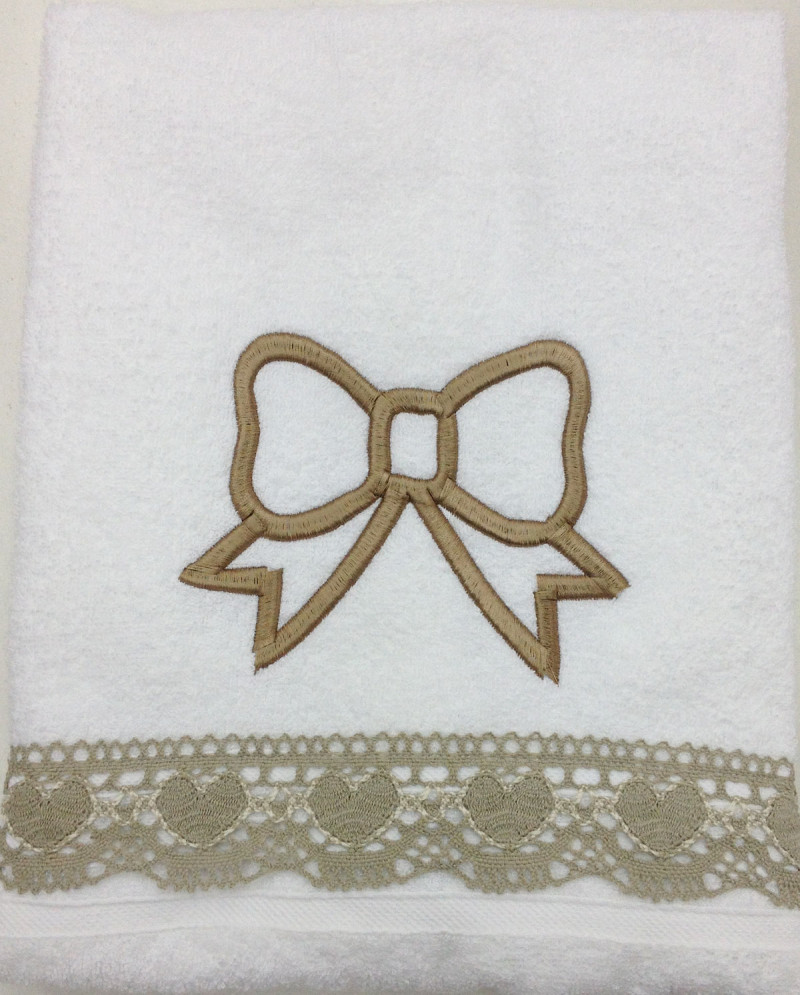 Sulla spugna è realizzato un ricamo con fiocco sui toni del beige.